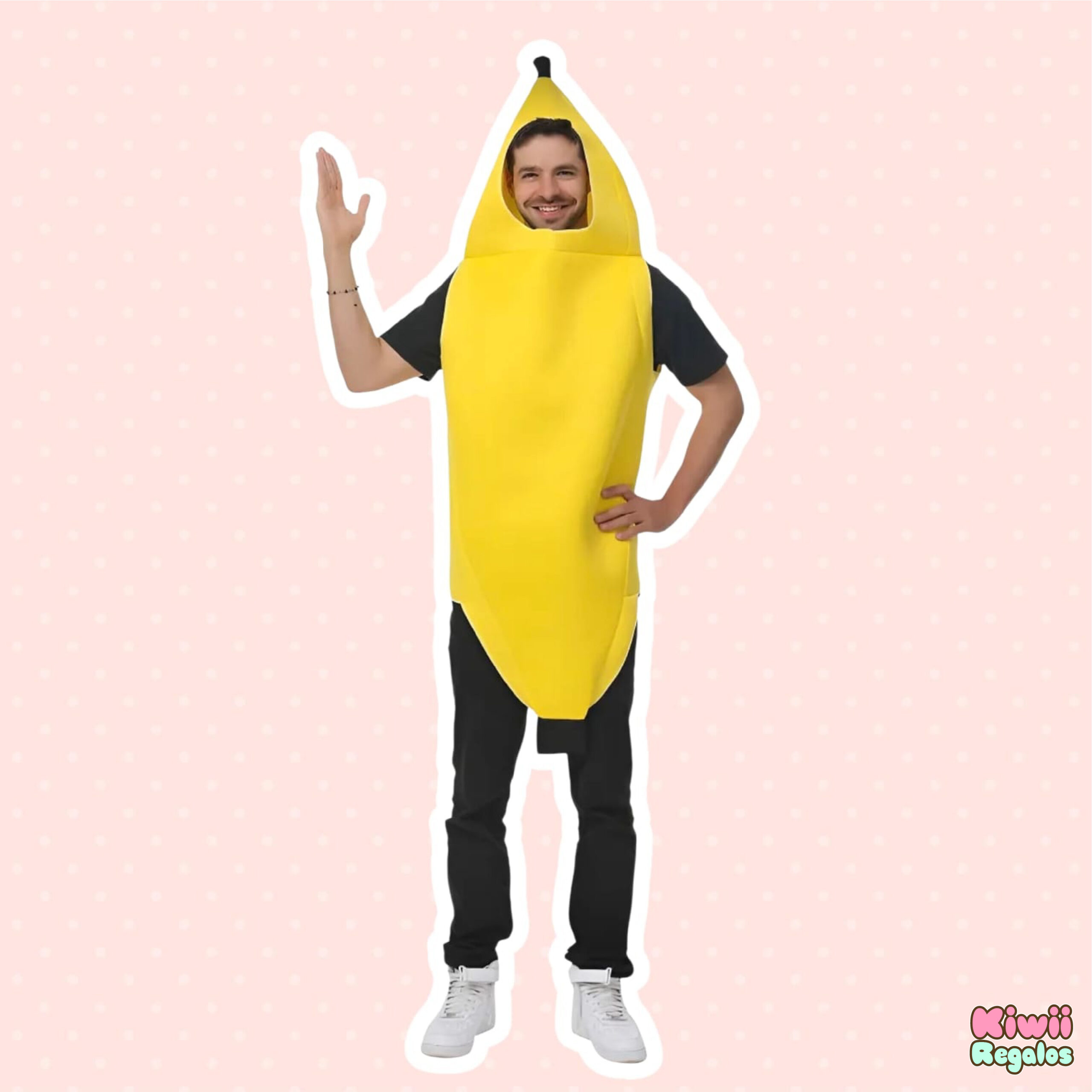 El disfraz de plátano mide 138cm de largo x 56cm de ancho. Alcanzando una circunferencia total de 110cm.