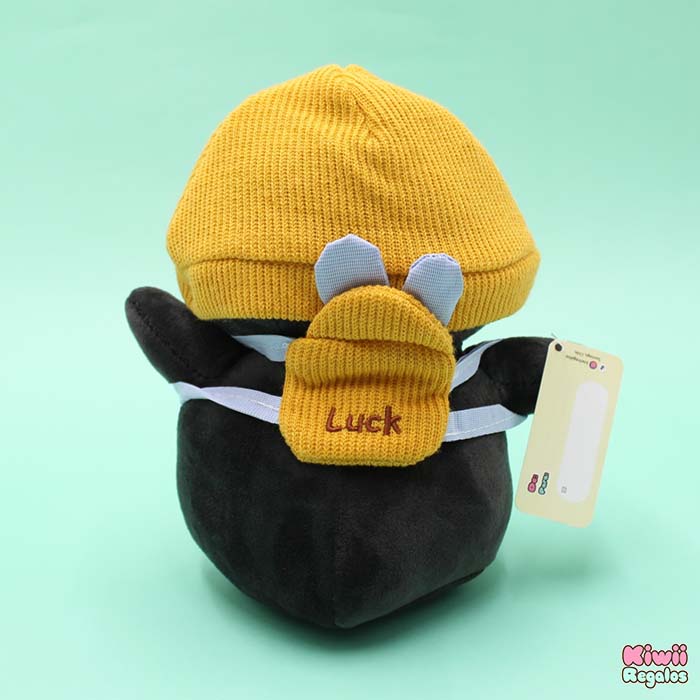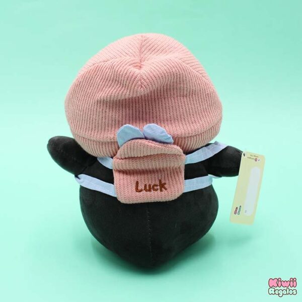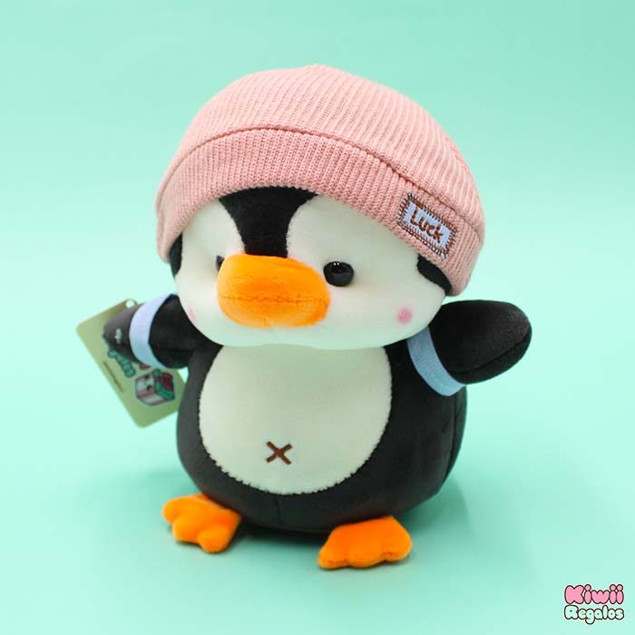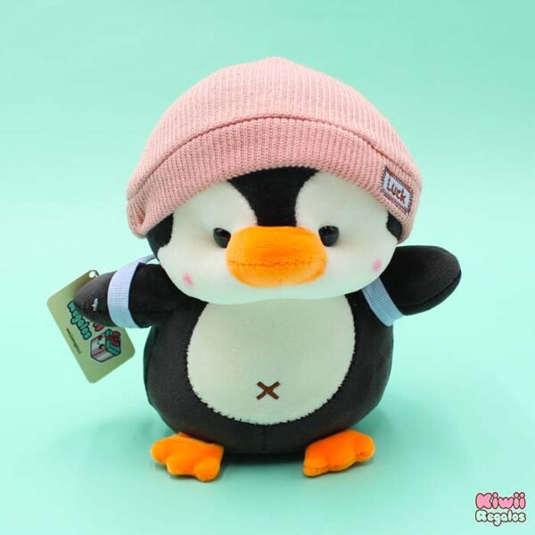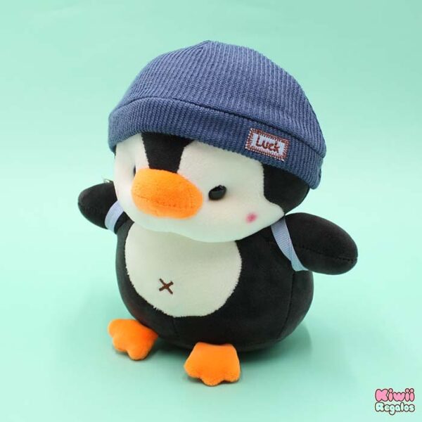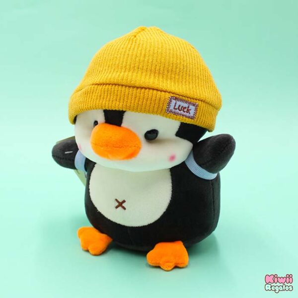 Peluche de Pinguino con gorro de lana y mochila. Animal kawaii. Dimensiones: 20cm x 15cm aprox. Material: Poliéster.